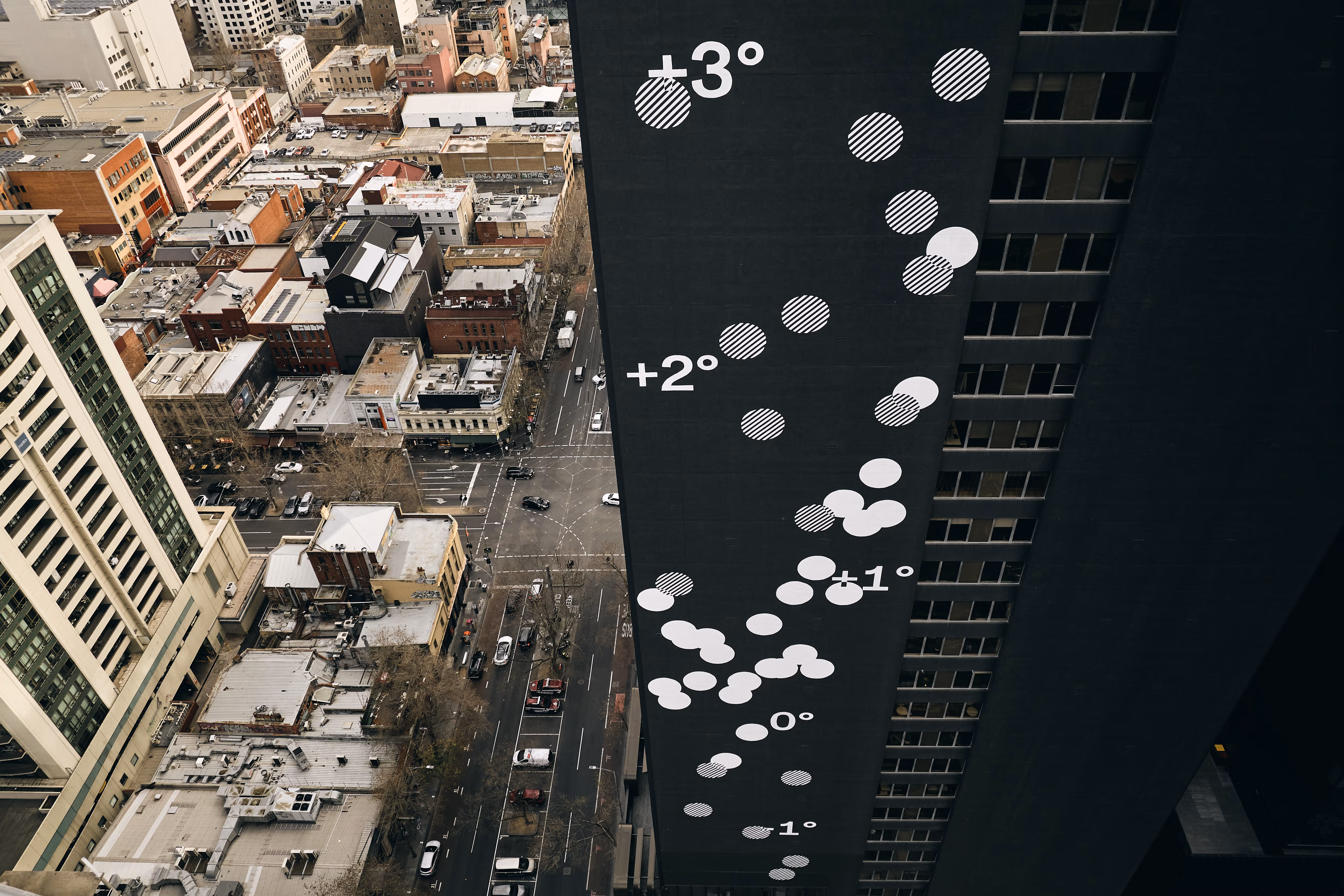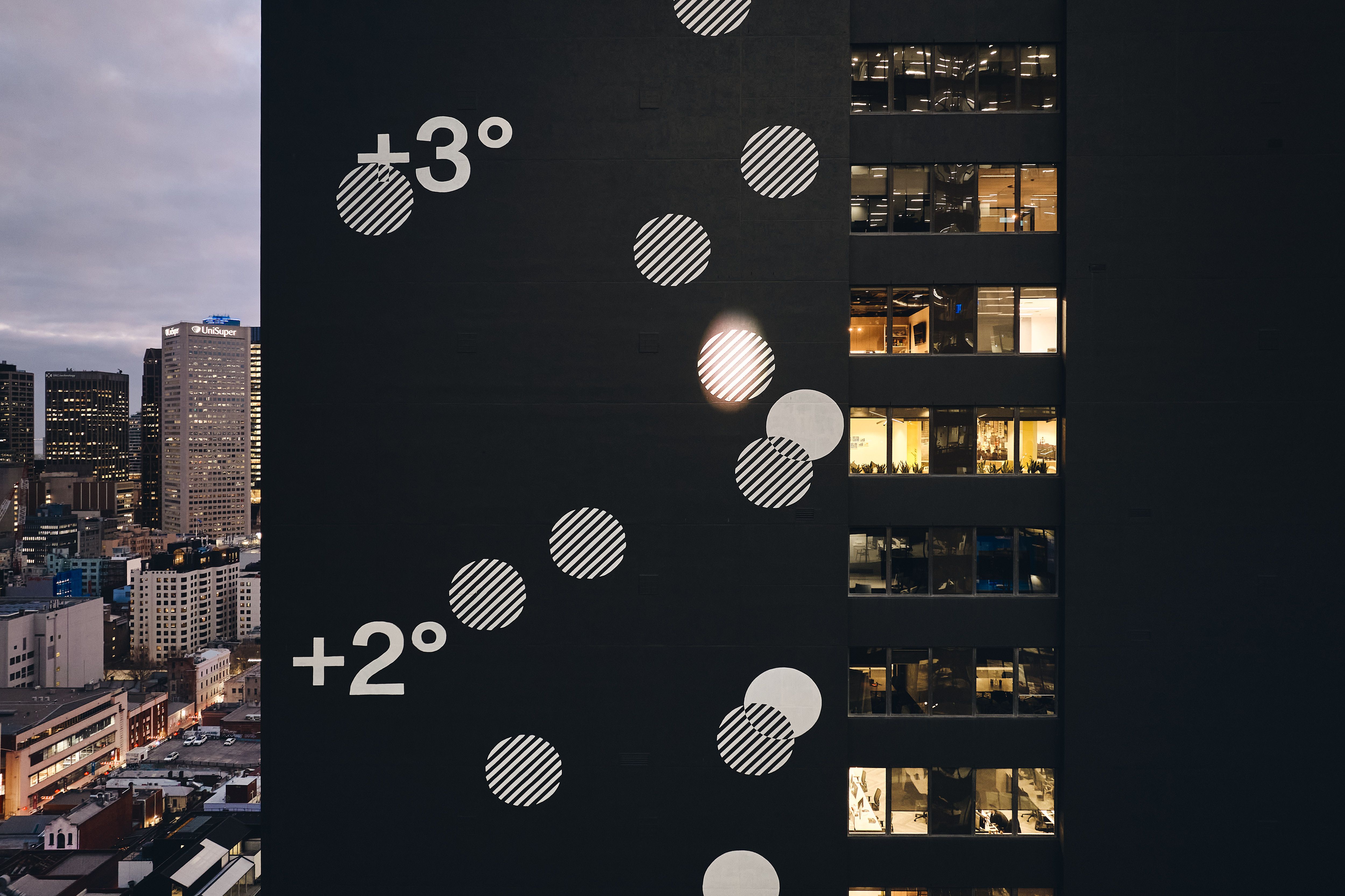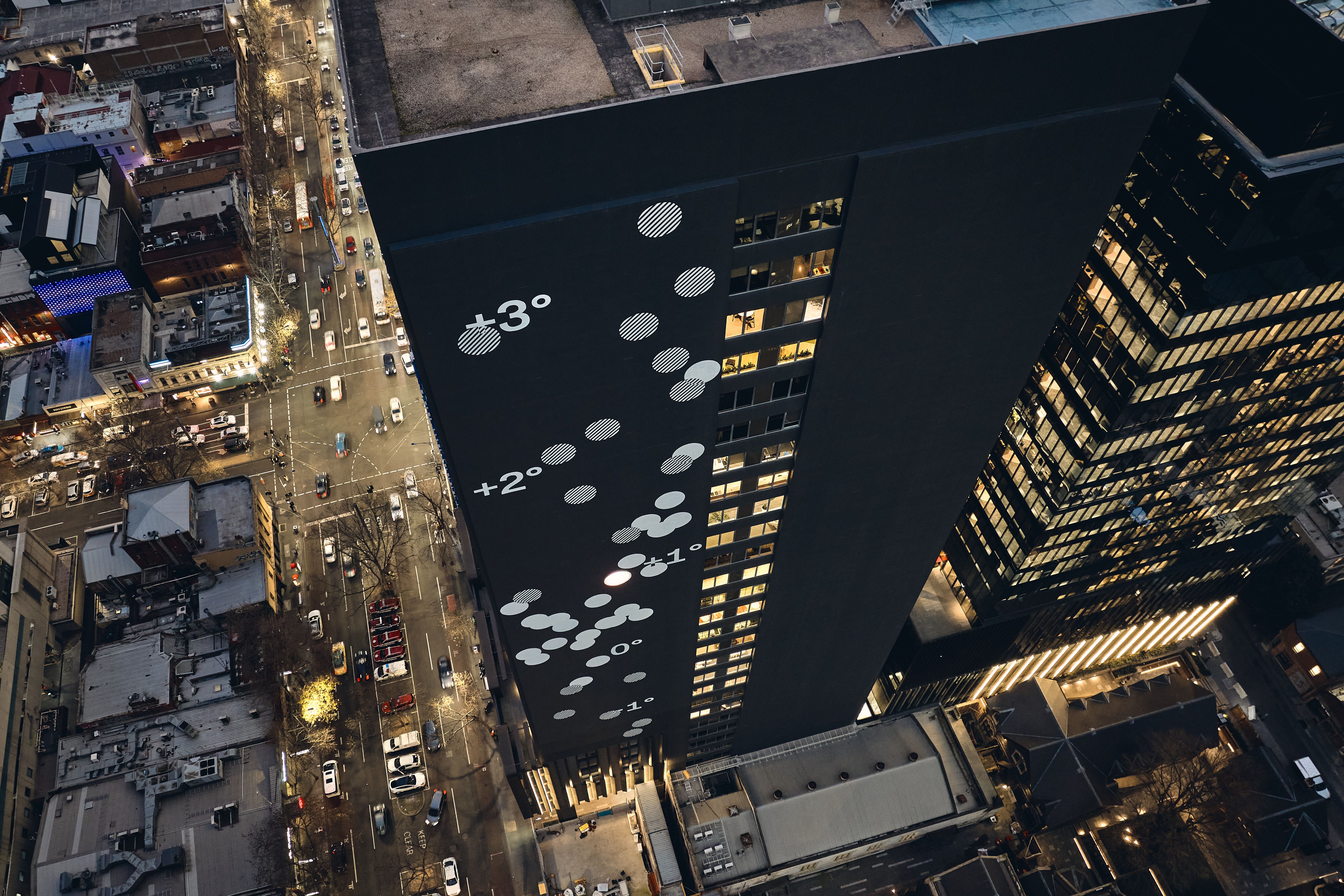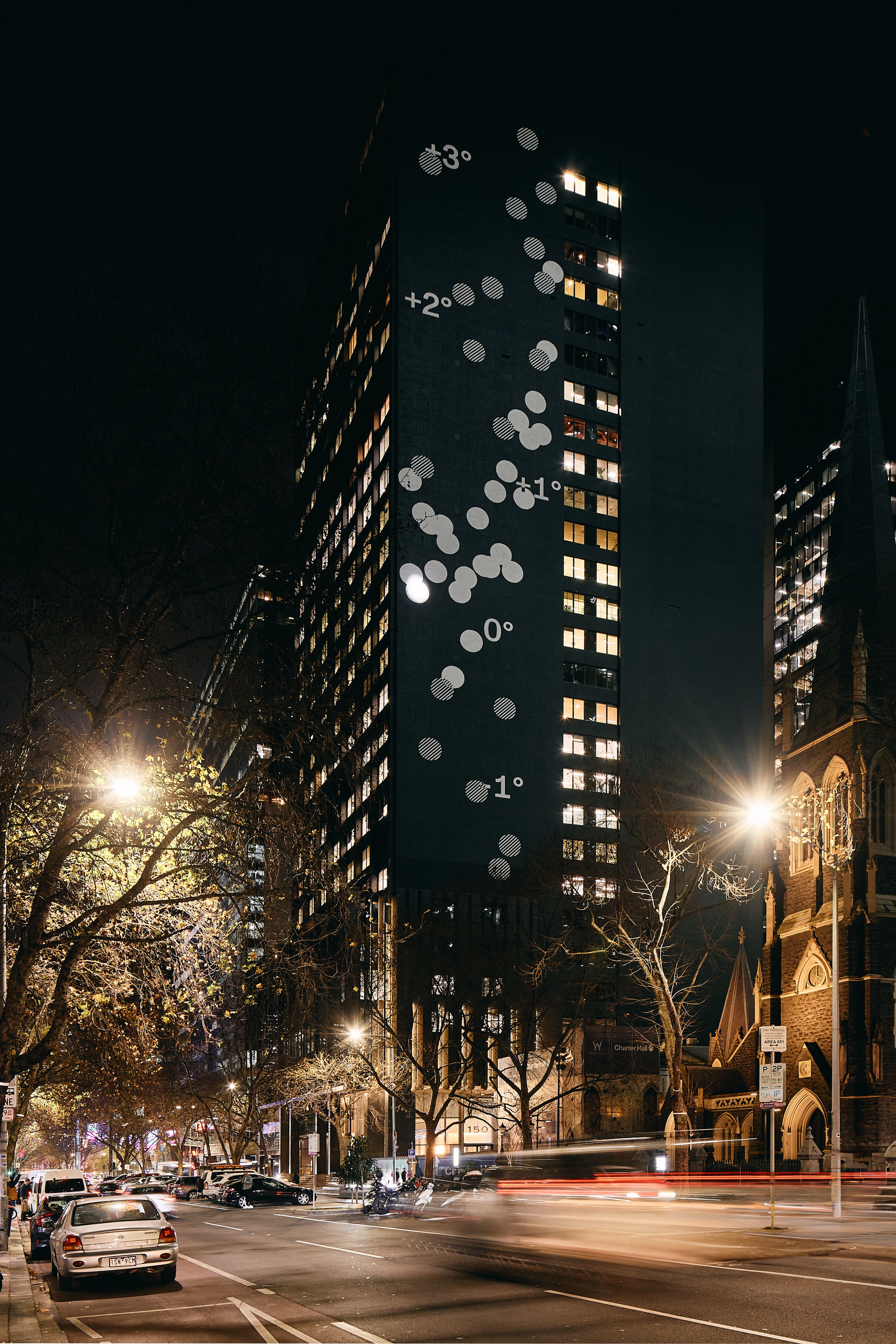 The permanent Melbourne installation on 150 Lonsdale Street's East Facade uses Bureau of Meteorology data to honor the building's history as the former BoM headquarters. Live weather feeds blend with decades of historical data, creating dynamic patterns that shift from day to night—making climate change visible in the city's CBD. Commissioned by Charter Hall as part of Wesley Place's community art initiative, the work has become a landmark meditation on Australia's changing temperatures.